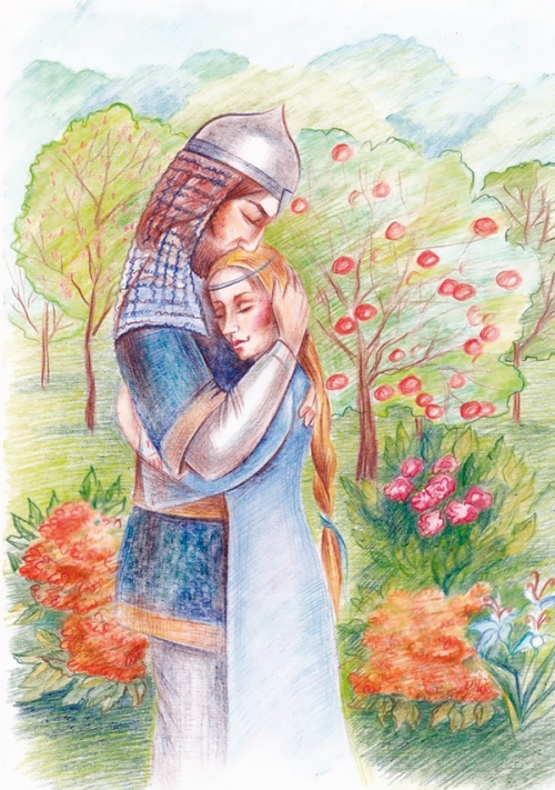 Девушка оглянулась вокруг и увидела, что Другие Красивые Цветы улыбаются ей. Но ее глаза искали Богатыря. И вот Лилия увидела его, выходящего из сада. Она побежала за своим родным человеком, окликнула его нежным голосом и, обняв, произнесла: