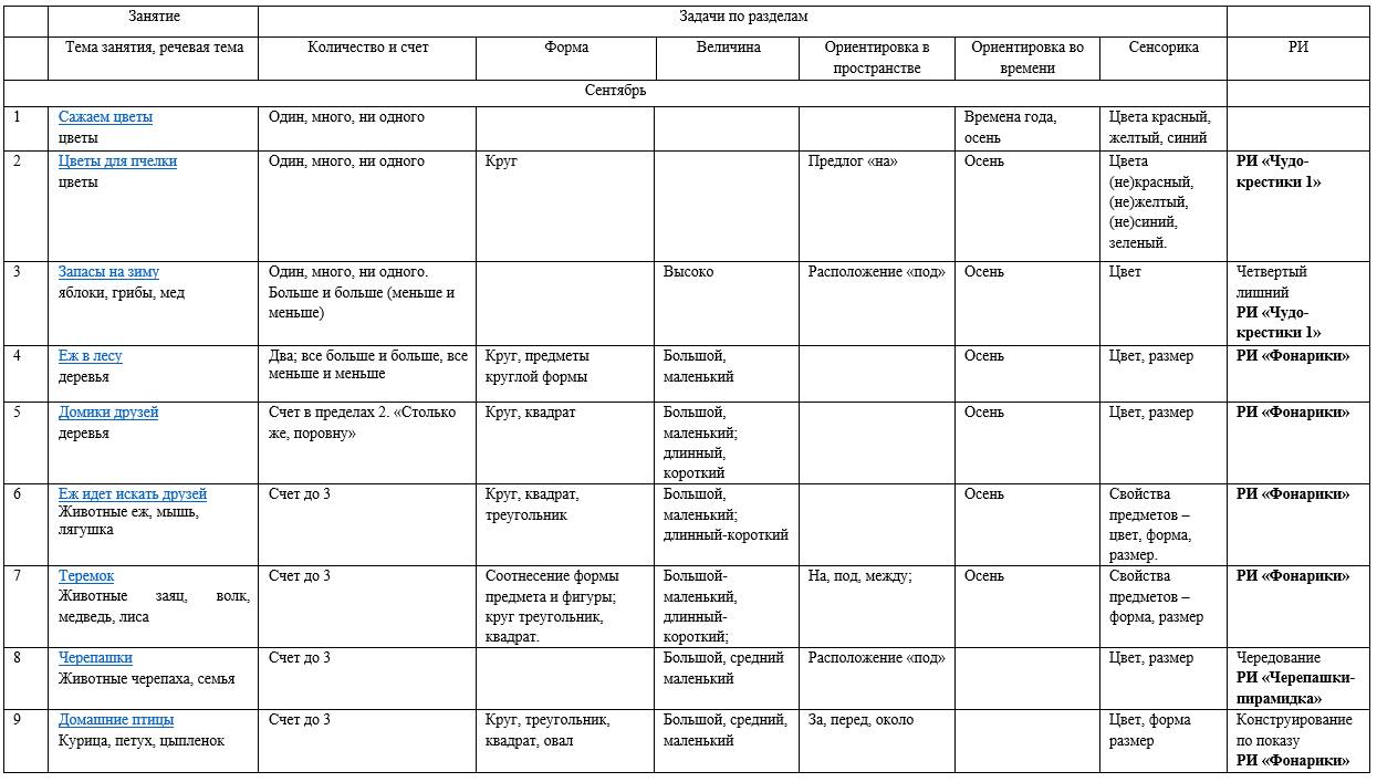 Исходя из вышеизложенного, в конспектах перечисляются только образовательные задачи в соответствии с разделами по РЭМП: количество, форма, величина, ориентировка в пространстве, ориентировка во времени. Такой подход дает возможность отслеживать в течение года логику и полноту предлагаемого материала.