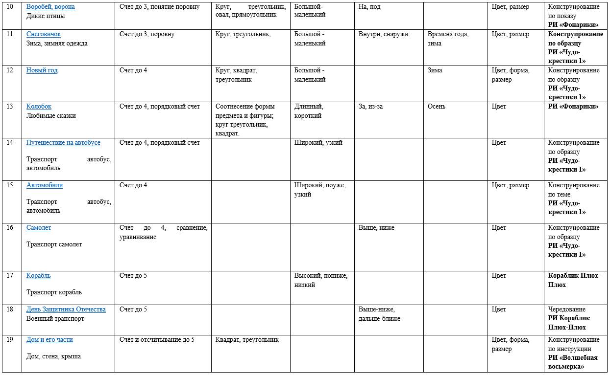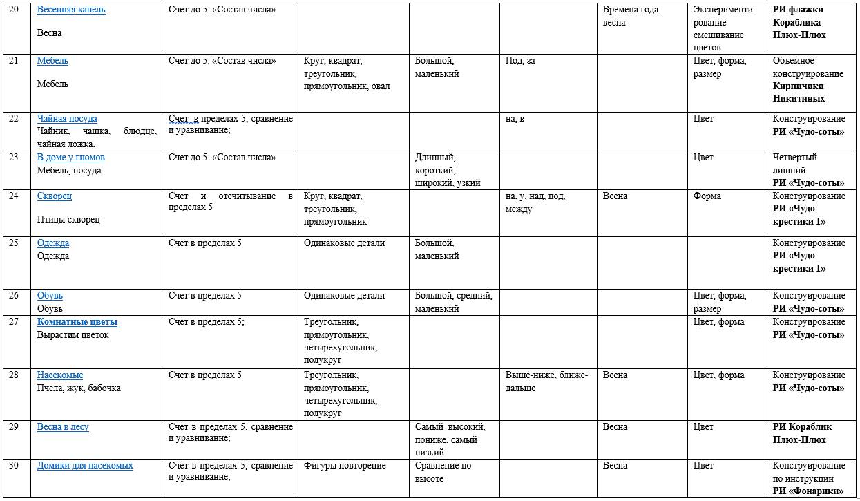 Методическое обеспечение дополнительной общеразвивающей программы для младшей группыРеализация Программы предполагает использование индивидуальных и фронтальных форм работы. В следующих таблицах приведено рекомендуемое количество пособий из расчета на 30 детей в группе. Дополнительные пособия позволяют организовать библиотеку развивающих игр.