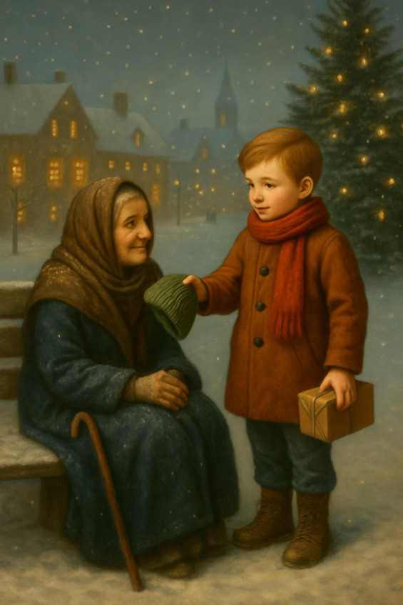 Саша вспомнил о том, как его мама всегда говорила: «Рождество – это время делиться любовью.» И он решил сделать что-то особенное. Он снял свою теплую шапку и отдал ее женщине. «Надеюсь, вам станет теплее,» – сказал он с улыбкой.