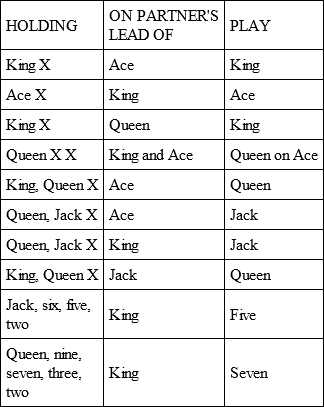 It is essential to good play that the dealer's adversaries should each gain definite knowledge of the others' holding. Any information that a play can convey is of inestimable help to them and of little or no benefit to the dealer, who is the master of his own two hands.