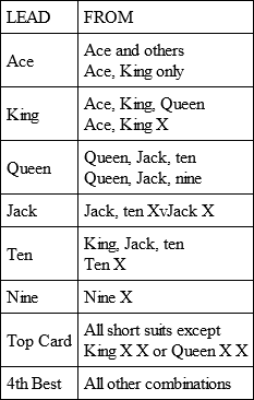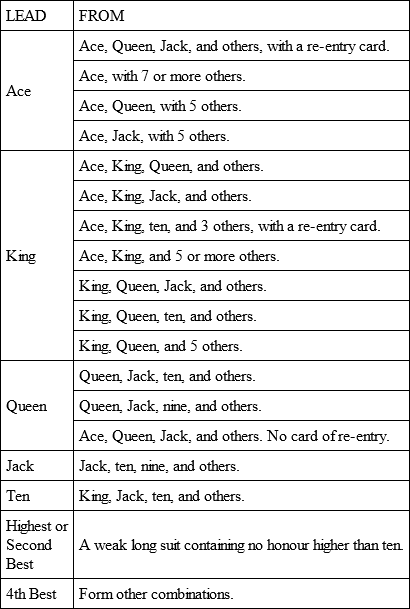 The reader will naturally ask, "How, when but two suits have been led, can I determine which of the two remaining to choose?" The cards in the leader's hand combined with those in the dummy will usually simplify the selection. Should the leader hold a re-entry in one of the remaining suits it is obvious that he has been asked to lead the other. When it happens that both the leader and the dummy are weak in both suits, the preference should usually be given to the one in which the combined hands contain the fewer number of cards.