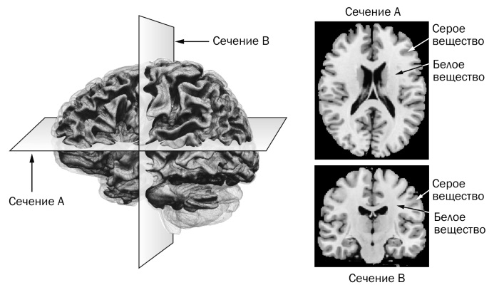 Горизонтальные и вертикальные сечения (углы среза A и В) показывают кору (серое вещество) на поверхности и белое вещество внизу.