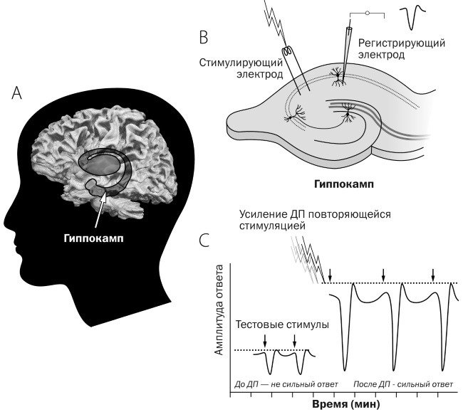 РИСУНОК 10. Долговременая потенциация (ДП) – это широко используемая модель «практического эффекта» обучения и памяти. A. Гиппокамп внутри височной доли. B. Активность клеток мозга, зафиксированная в гиппокампальных срезах, взятых у грызунов, показывает изменения в клеточных сигналах после стимуляции. C. Эксперименты с ДП обычно фиксируют повторяющиеся небольшие реакции на стимулы до тех пор, пока не будет дана серия стимулирующих импульсов (это похоже на «практический эффект»). После чего реакции нейронов на первоначальные стимулы усиливаются, как будто они были «запомнены».