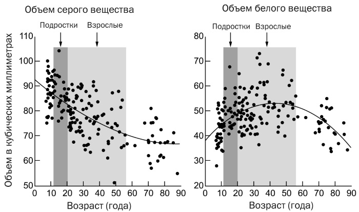 Чем объясняется потеря серого вещества на столь раннем этапе развития человека, когда многие когнитивные и познавательные функции еще в полной мере не развиты? В последние несколько лет исследователи обнаружили прямую корреляцию между уменьшением у подростков серого вещества и увеличением белого вещества. Ученые знают, что серое вещество продолжает уменьшаться и во взрослой жизни, особенно после шестидесяти лет, но они считают, что уменьшение объема серого вещества в подростковом возрасте – это существенно иной процесс. В дальнейшей жизни серое вещество уменьшается вследствие дегенеративных процессов, то есть происходит сжатие клеток и их отмирание, в то время как в подростковом возрасте уменьшение серого вещества является следствием пластичности мозга. («Используй или потеряешь!»)