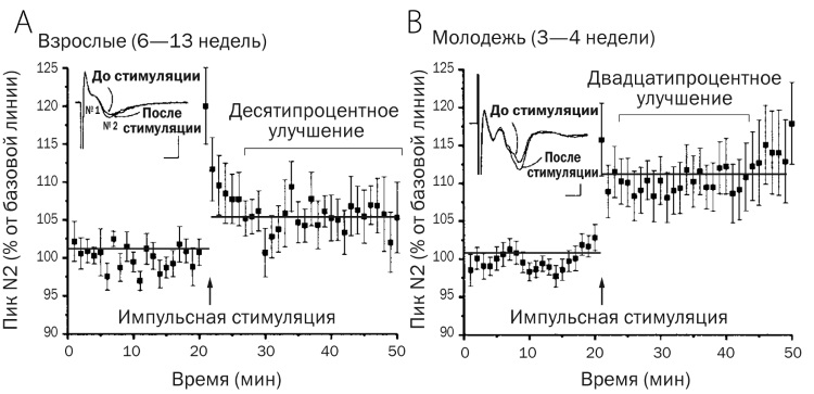 РИСУНОК 13. Синаптическая пластичность подростков гораздо выраженнее, чем у взрослых. Чтобы проверить, выше ли способности к обучению у подростков по сравнению с взрослыми из-за наличия у них лучшей ДП, исследователи сравнили срезы гиппокампа подростков с аналогичными срезами у взрослых. Сигнал после импульсной стимуляции у подростков (B) был значительно выше и продолжался дольше, чем у взрослых (A).