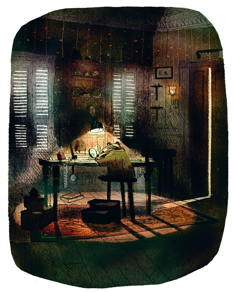 Он обнаружил Скунса в своей камнекомнате. («В моей камнекомнате!») Скунс глазел по сторонам. Изучал груду жеодов в камине.