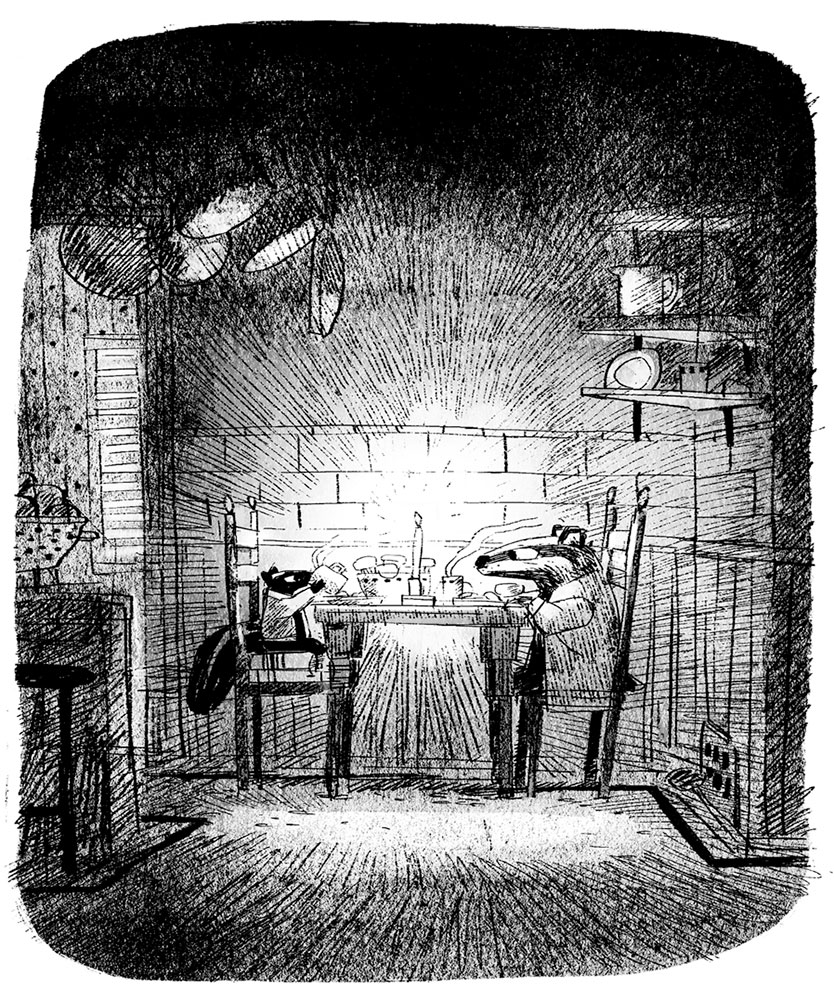 И тогда они – Скунс на одной стороне стола, Барсук на другой – повернулись к своим тарелкам и принялись за еду.