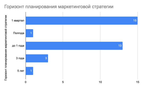 Согласно нашему опросу, эксперты разрабатывают стратегию периодом до 5 лет, но чаще всего они мыслят категориям квартала или года. Под стратегией, обычно подразумевается фундаментальный документ на долгие годы вперед, однако ее регулярно нужно обновлять и корректировать – не только конкуренты, но и сам маркетинг и экономическая ситуация меняются.
