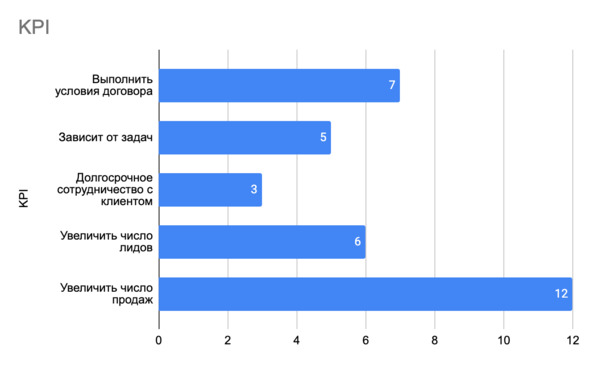 Данный вопрос показателен с той стороны, что эксперты разделились на два больших лагеря, в одном из которых главная цель – выполнить условия договора, какими бы они не были, в другом – увеличить число продаж во что бы то ни стало. И надо отменить, что всего три эксперта ответили – что его главный KPI заключается в том, чтобы его клиент стал постоянным.