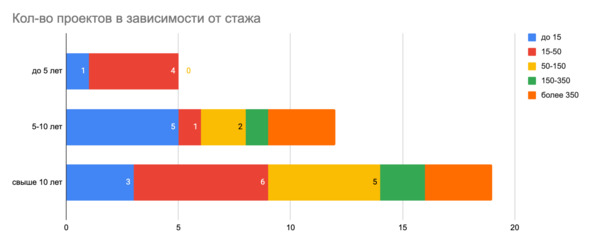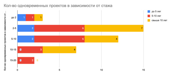 В среднем, один наш эксперт может вести 5,82 проекта одновременно. Всего 3 из 33 сказали, что берутся не более чем за 2 проекта за раз. Чем опытнее эксперт – тем большее количество одновременных проектов он может вести.
