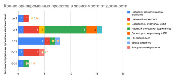 Фрилансеры одновременно ведут 2—5 проекта, наемные специалисты – до 15, а владельцы маркетинговых агентств, чаще всего, и того скромнее – от 5 до 10 за раз. Предполагаю, что это связано с размером команды, которая может работать над проектами.