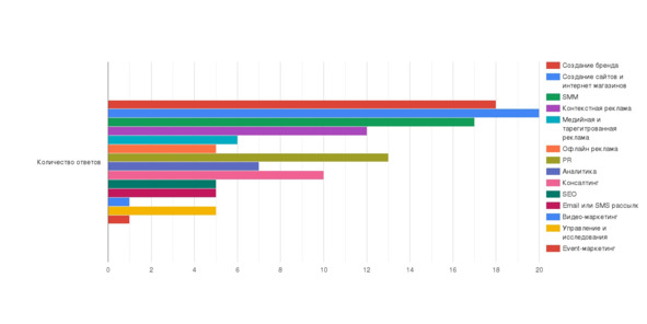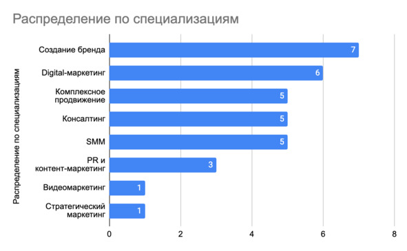 На графике ниже – наглядно видно, что большая часть экспертов занимается брендингом (21,21%), крайне популярны: digital-маркетинг (18,18%), консалтинг (15,5%), SMM (15,15%) и комплексный подход (15,15%). Это отражает реальный запрос рынка и его тенденции: клиентам нужен бренд, охватывать многие рекламные каналы и не боятся советоваться. Интересным наблюдением для молодых специалистов будут – неконкурентные сферы (у них меньшее количество голосов или их вообще нет на графике) и там можно вырасти быстрее всего. Эта же информация пригодится, если вы запускаете новый продукт в своем агентстве, с точки зрения спроса (SMM и бренд в моде, там больше всего и специалистов) и с точки зрения подбора кадров.