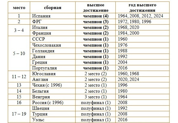 Рейтинг выступлений сборных на чемпионатах Европы по лучшим достижениям