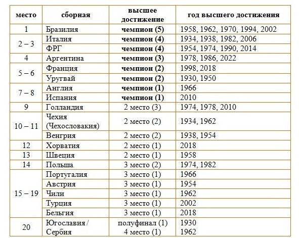 Рейтинг выступлений сборных на чемпионатах мира по лучшим достижениям