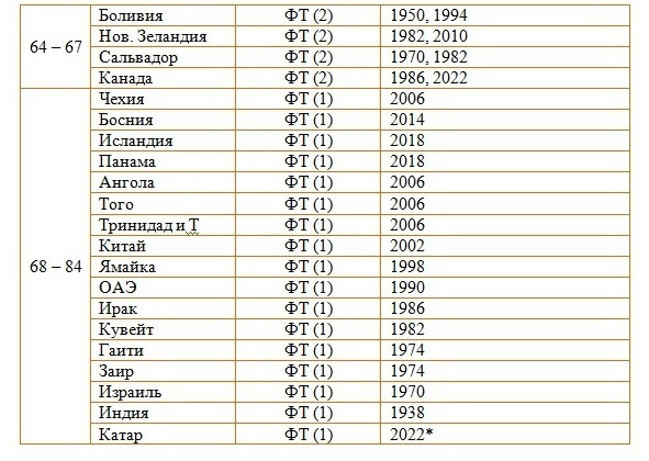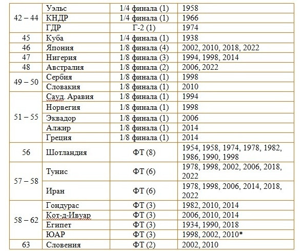 Г-2 – попадание во 2-ю групповую стадию финального турнира (формула с двумя групповыми стадиями применялась на ЧМ 1974, 1978 и 1982 годов).
