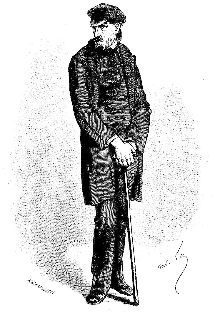 Перед ней стоял худощавый малый, с большой головой, ширококостный, бородатый, с очень тонким носом, с маленькими светлыми глазами; на нем была черная фетровая шляпа, измятая и порыжелая, и широчайшее, застегнутое наглухо пальто, когда-то нежно-каштанового цвета, теперь же вылинявшее; от дождей оно пошло зеленоватыми полосами. Немного сутулый, он весь как-то беспокойно, нервно дергался, что, должно быть, вошло у него в привычку. Он был в толстых зашнурованных башмаках, а из-под коротких панталон виднелись синие чулки.