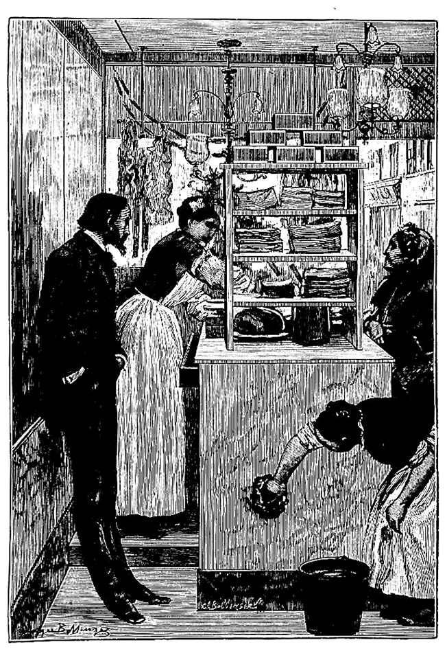 Ей пришлось заняться с дамой, зашедшей купить фунт котлет с корнишонами. Лиза вышла из-за прилавка и подошла к деревянной колоде, поставленной у задней стены. Она отрезала узким ножом от четверти свиной туши три котлетки и, подняв обнаженной сильной рукой тяжелый резак, хлопнула им три раза по отрезанному мясу. При каждом из этих трех ударов юбка ее черного мериносового платья слегка приподнималась, а на туго натянутой материи корсажа обозначался ус корсета. Сохраняя глубокую серьезность, Лиза неторопливой рукой собрала котлеты и взвесила их; губы ее при этом были сжаты, взор ясен.