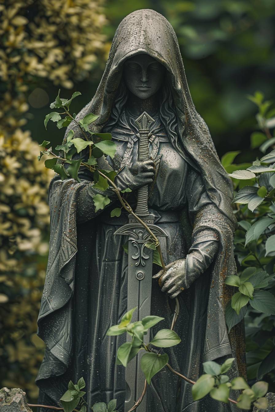 Изваяние прекрасной женщины, укрытой плащом, дарило какой-то странный покой. На неё хотелось смотреть, её хотелось касаться. В одной руке женщина держала меч, а через пальцы второй руки проходило вьющееся растение. Растение смотрелось очень гармонично, словно рука Богини была специально для этого оставлена без какого-либо предмета.