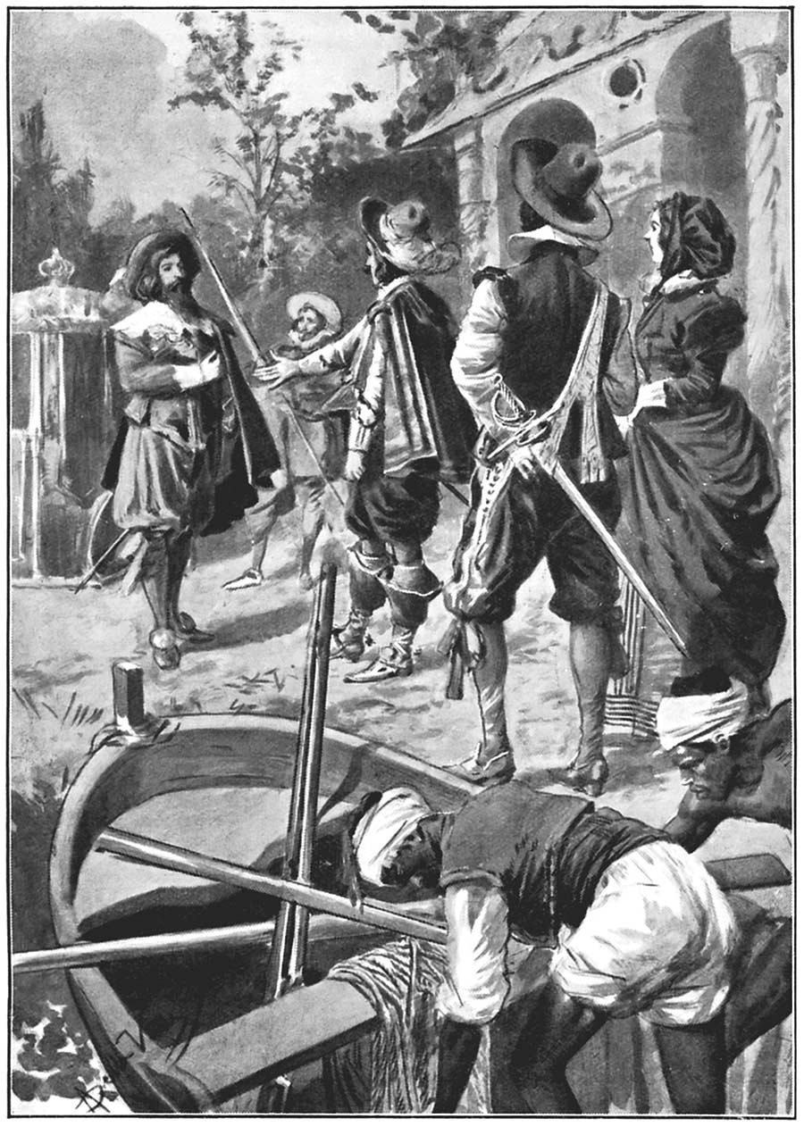 Возле калитки павильона, опираясь на пилястр, стояла прекрасная андалусийка; в руках она держала платок и время от времени махала им в знак расставания; в нескольких шагах от нее находился буканьер, скрестивший руки на стволе своей аркебузы.