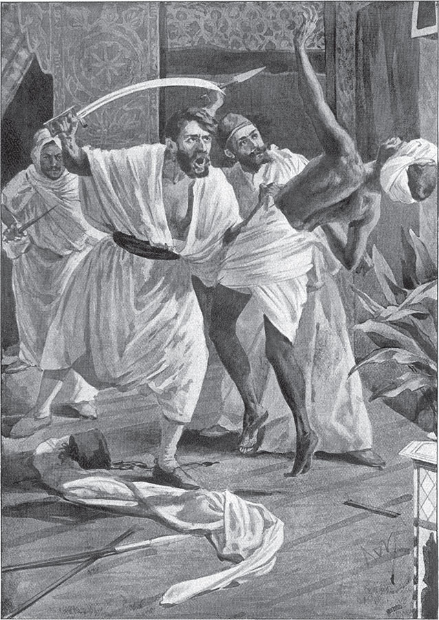 Потрясенные кисуры в ужасе уставились на силача, однако их замешательство длилось недолго. Подгоняемые криками визиря, они наконец вспомнили об огнестрельном оружии и прицелились в трех непокорных пленников, принуждая сдаться.