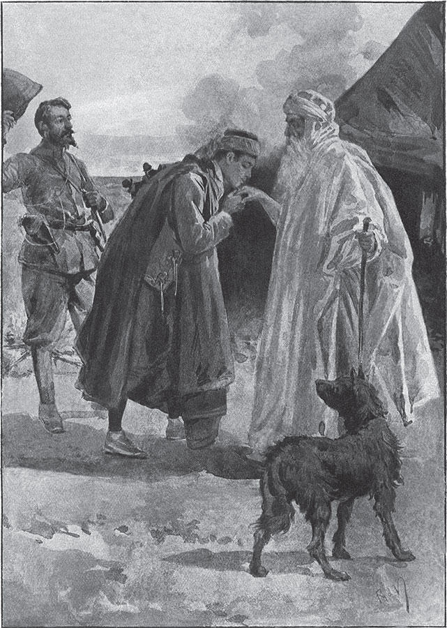 Трое товарищей пришпорили коней и быстро достигли шатров. У входа в лагерь их поджидал благообразный старец с длинной белой бородой, впрочем, невзирая на годы, еще крепкий и сильный. На нем был грубошерстный плащ. Старик шагнул навстречу и произнес: