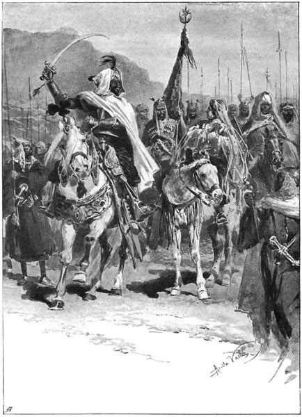 Он сидел на белом арабском скакуне с длиной гривой, в неслыханно роскошной сбруе. На голове у коня красовался огромный султан из страусовых перьев, широкие поводья, какими и в наше время пользуются марокканцы и берберы, были украшены резным узором с позолотой, кармазинный бархатный чепрак с золотыми кистями доходил до самой холки, а на пистолетных кобурах, обшитых голубым бархатом, красовались серебряные полумесяцы.