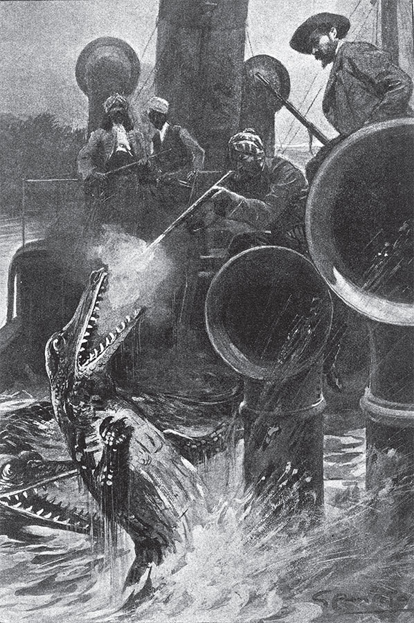 Судно, в очередной раз ударившись о какой-то подводный камень, неторопливо двинулось вниз по реке. Течение явно замедлилось из-за прилива, который в экваториальных широтах нередко ощущается даже за сотню миль от устья. Баркас угрожающе раскачивался: перепуганные крокодилы сновали по палубе, чувствуя себя в западне. Неразумные, как и их африканские и американские сородичи, они ползали вокруг трубы, не в силах найти пролом, приведший их на баркас.