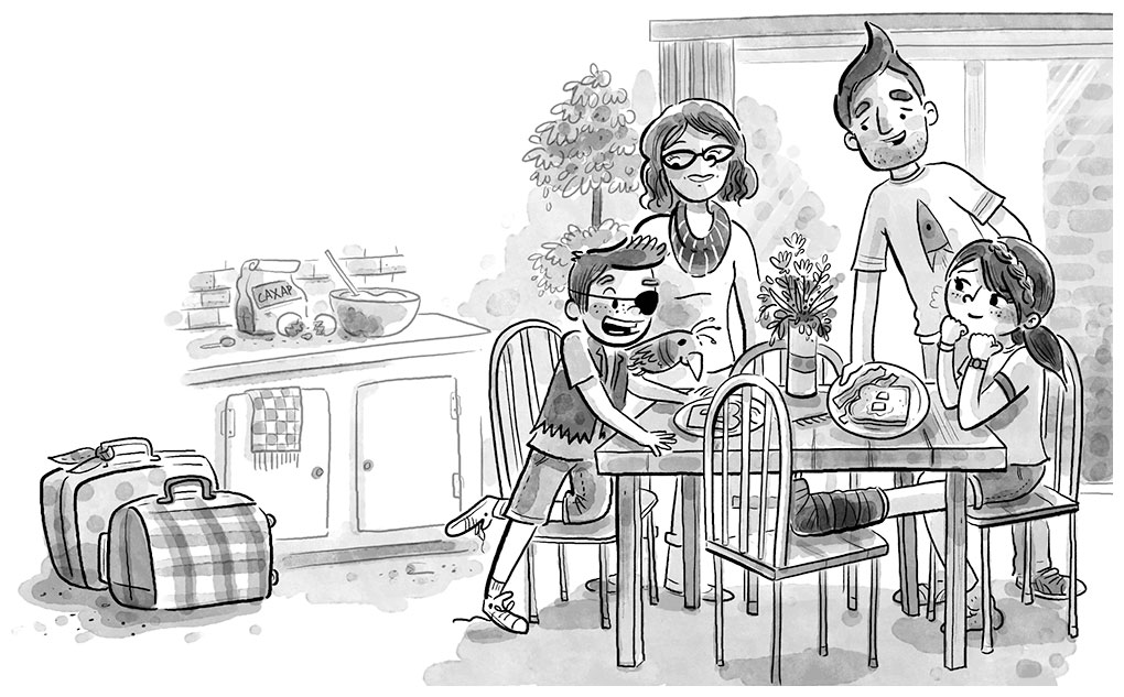 Ада попробовала улыбнуться и на костылях последовала за мамой вниз по лестнице, но тут её брат Эллиотт чуть не раздавил её у самого входа на кухню. На нём был надет жилет, а на глазу была чёрная повязка. С плеча безжизненно свисал мягкий игрушечный попугай.