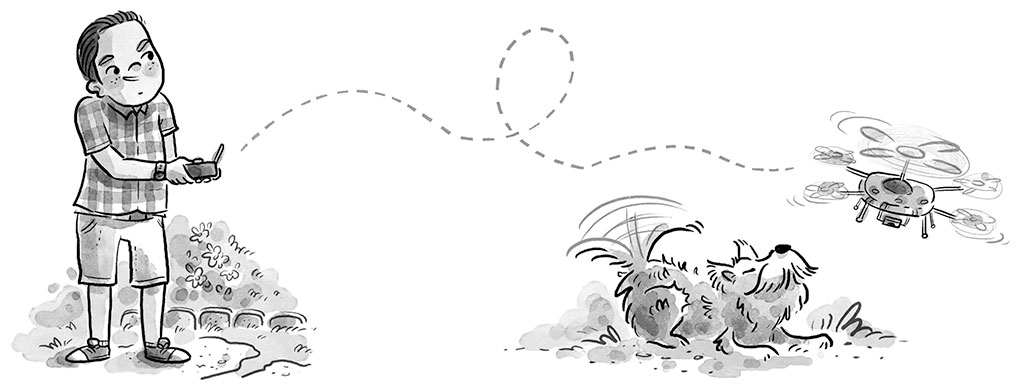Ада привстала повыше на костыле, чтобы посмотреть. Снаружи в саду Милтон, мальчик, чей дом был третий справа от аллеи, наблюдал за дроном, летающим по двору. Казалось, дрон привлёк всеобщее внимание. Джек и Эллиотт побросали мечи, мистер Комбинезон подошёл к окну, а собачка мисс Рид злобно залаяла. Милтон направил летательный аппарат так, чтобы он завис прямо над Хризантемой. Поток воздуха от роторов раздувал её шерсть. Хризантема взвизгнула и побежала обратно к двери своего дома. Мисс Рид вышла наружу: