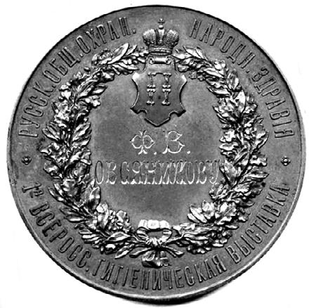 Медаль Общества охранения народного здравия, врученная Ф. В. Овсянникову на 1-й Всероссийской гигиенической выставке (1893). Публикуется впервые; из коллекции Е. Л. Полякова