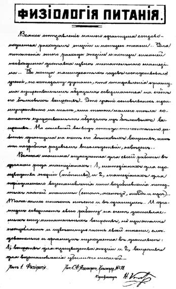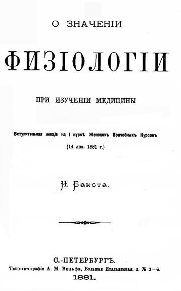 В последней работе, являющейся по существу вступительной лекцией курса, автор обращает внимание читателя на то, что: «…Физиология занимает центральное место в кругу медицинских наук прежде всего в том смысле, что к ней стекаются все другие вспомогательные познания медицинского образования, по физике, химии, гистологии и пр., получая здесь живой смысл и живое значение <…> важнее тут еще то обстоятельство, что она служит самым надежным фундаментом для всех отраслей клинической медицины, – другими словами, что от нее, как от центра, радиально расходятся лучи во все области патологии и терапии. <…> Говоря словами Гельмгольца, физиология представляет среди естественных наук, тот «освежающий источник», в котором практическая медицина черпает свою жизненную свежесть и силу для дальнейшего развития» [6, с. 5].