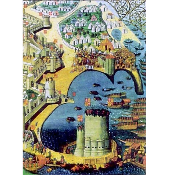 Остров Родос и его порт в 1486 году. Фрагмент гравюры на меди.