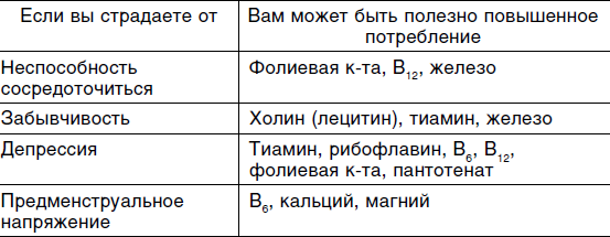 «Витамин В6 необходим для производства серотонина – основного нейротрансмиттера, участвующего во многих функциях организма, – говорит доктор медицины Эрик Брейверман из Принстонского Центра биологии мозга в Скиллмане, штат Нью-Джерси. – Фолаты (производные фолиевой кислоты) помогают вырабатывать катехоламины, которые управляют многими телесными функциями. В12 необходим для производства ацетилхолина, еще одного нейтротрансмиттера. Другими словами, все химические вещества, производимые клетками мозга, зависят от питательных веществ, поглощенных организмом, и во многих случаях они, по-видимому, зависят от определенных витаминов группы В».