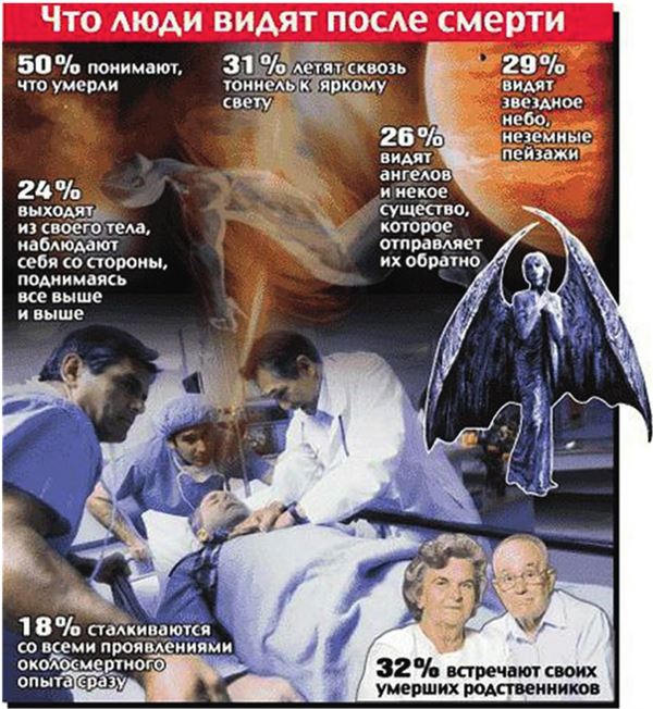 Люди, побывавшие на том свете, рассказывают, что видели. Многие видят одно и то же Исследовательница производила мониторинг состояния пациентов, страдающих острой сердечной недостаточностью. 52 из них умерли, но воскресли. Пока больные добирались до порога ТОГО СВЕТА, находились там и возвращались обратно, исследовательница брала у них кровь на анализы. Из числа воскресших 11 человек доложили, что побывали где-то, рассказали о – тоннеле, свете, ангелах и прочих 308
