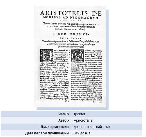 «Никома́хова э́тика» или «Этика Никомаха» (др. – греч. Ἠθικὰ Νικομάχεια) – одно из трёх этических сочинений Аристотеля[69]. Считается, что название «Никомахова» данная работа получила, поскольку была издана впервые (около 300 года до н. э.) именно Никомахом – сыном Аристотеля[70]. Возможно, что книга посвящена Аристотелем его сыну Никомаху, или своему отцу, которого тоже звали Никомах[71].