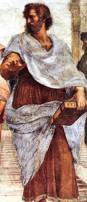 Аристотель с «Никомаховой этикой» на фреске Рафаэля «Афинская школа»