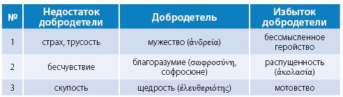 Вторая книгаАристотель делит все добродетели (ἀρετῆ) на нравственные (ἠθικῆς, этические) и мыслительные (διανοητική, Добродетели не являются врождёнными, но приобретаются через воспитание. Задачей государства является как раз воспитание добродетелей. Природа добродетелей такова, что их губят избыток и недостаток. В определённой степени они заключаются в обуздании страстей. Таким образом, каждая из этических добродетелей представляет собой середину между крайностями.