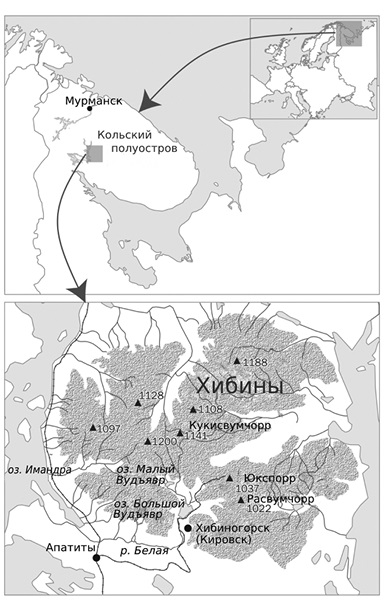 Естественные процессы сформировали Хибинские горы и их окружающую среду задолго до вмешательства человека. Триста миллионов лет назад вулканическая магма из недр Земли начала медленно просачиваться в породы, образовавшие Фенноскандинавский щит. Застынув, магма превратилась в большой массив нефелино-сиенитовых пород. Позднее геологические процессы способствовали формированию внутри нефелиновой руды апатитов. В течение последних шестидесяти пяти с половиной миллионов лет движение тектонических плит вытолкнуло наружу эти подземные массы. Они стали горным массивом, простирающимся на более чем километровой высоте над уровнем моря и занимающим площадь около 1327 квадратных километров239. С этих пор Хибинские горы стали единым целым с окружающей их средой. В центре южной части массива расположилась долина с двумя маленькими озерами – Большой Вудъявр и Малый Вудъявр. Из озера Большой Вудъявр в озеро Имандру на западном конце Хибин вытекает река Белая. Над озерами Вудъявр возвышаются несколько горных массивов, богатых апатитами: Расвумчорр, Кукисвумчорр и Юкспор. Доиндустриальные экосистемы региона представляли собой болотистые таежные леса, в основном сосновые в низинах, и альпийскую тундру на горных участках, где росли лишь мхи и лишайники. Некоторые крупные животные, такие как волки, росомахи, песцы и северные олени, жили на суше, и разнообразные виды обитали в горных реках и озерах240.