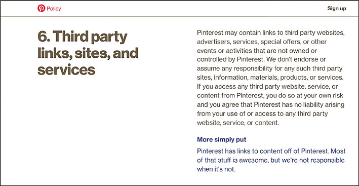 Рис. 1.3. В условиях обслуживания Pinterest слова применяются для проектирования опыта, значительно более полезного, чем большинство юридических соглашений, к которым принуждают пользователей[5]