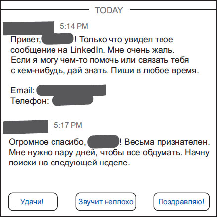 На рис. 1.5 приводится беседа двух человек на LinkedIn. Один из них предлагает помощь знакомому, который недавно был уволен. Тот в ответ благодарит и сообщает, что ему нужно некоторое время на осознание произошедшего.