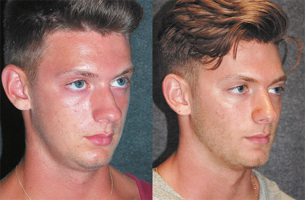 Рис. 1: Фотографии мужчины до (слева) и после (справа) ринопластики и увеличения подбородка для гармонизации баланса лица. Уменьшение носа пациента и увеличение его подбородка позволило создать более мужественный вид. Работая с мужчинами, главное – не переусердствовать, чтобы не получить в результате женственное лицо.