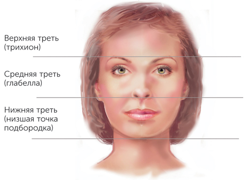 Руководящим принципом оценки пропорций является правило третей, первоначально описанное Леонардо да Винчи. Трети лица простираются от линии роста волос до линии глабеллы (бровей), от бровей до основания носа и от основания носа до подбородка. При правильных пропорциях эти трети равны между собой (рис. 2).