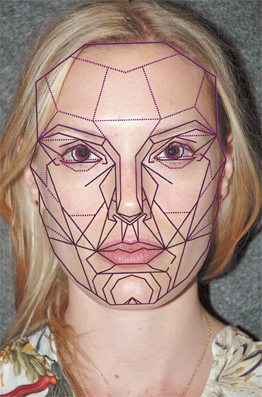 Рис. 6. Золотая маска Марквардта, которая представляет собой лицо с идеальными пропорциями. Маска наложена на лицо привлекательной женщины. Обратите внимание, как ее глаза, нос, щеки и губы соответствуют золотому сечению