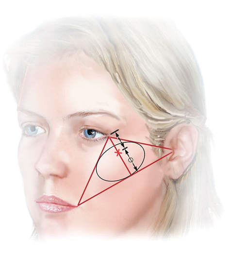 Рис. 11. Самая выступающая точка идеальной скулы должна находиться на линии, проведенной от основания треугольника к уголку глаза