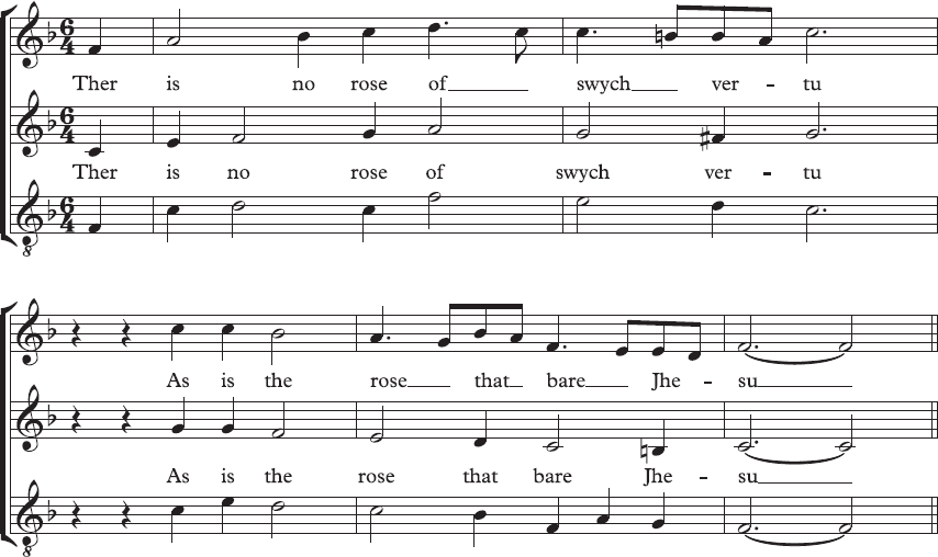 Нотная запись трехголосного рефрена английского кэрола XV века There is no rose, выполненная в Тринити-колледже Кембриджа, на которой хорошо видны характерные цепочки трезвучий в первом обращении и не менее характерная терцо-секстовая каденция