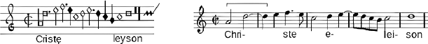 c) Мензуральная нотация на пяти линейках с использованием ключа до: точная ритмическая запись, позволяющая двум или более голосам петь вместе. Первые две ноты – лигатура. Справа – современная транскрипция.