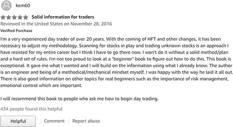 «Мой опыт дейтрейдинга составляет уже более 20 лет. С распространением высокочастотной торговли и других изменений возникла необходимость в корректировке моих методов работы на рынке. Сканирование “акций в игре” и торговля неизвестными акциями – это тот подход, которому я сопротивлялась на протяжении всей своей карьеры, но сейчас я полагаю, что должна заняться именно этим. Но я не буду этого делать без надежного плана и жесткого набора правил. Я не слишком горжусь тем, что использую в качестве источника информации книгу “для чайников”. Эта книга исключительна. Она дала мне то, что я искала, и я буду пользоваться полученной из нее информацией в дополнение к тому, что я уже знаю. Автор книги является инженером, и я, как человек с методическим/механическим складом мышления, была счастлива от того, как он изложил материал. В книге имеется также полезная информация по другим темам для настоящих новичков, например, о важности управления рисками и эмоционального контроля.