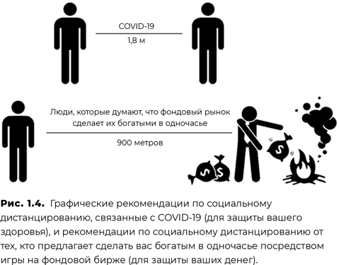 Держитесь подальше от каждого, кто думает, что игра на фондовой бирже – это схема с быстрой отдачей. На рис. 1.4 показаны две особенно важные директивы по социальному дистанцированию, актуальные в свете борьбы с пандемией COVID-19 в 2020 г. Одна из них защищает ваше здоровье; другая – ваши деньги! Держитесь подальше от тех, кто считает, что акции предназначены для того, чтобы помочь вам разбогатеть за одну ночь!