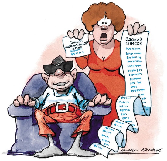 Первый список совсем коротенький, а второй – очень длинный, но Мэри всю супружескую жизнь концентрируется на коротком, то есть на небольшом количестве раздражающих минусов. «Вечно он за завтраком свои дурацкие газеты по всему столу разбрасывает», «Никогда ведь за собой сиденье в туалете не опустит», – думает она. Но вот случается беда, и Фред попадает под грузовик. Уже к утру Мэри переключается на длинный список: «Фред у меня был просто ангел… Добрый, открытый, работящий… Ах, какой же хороший у меня был муж».